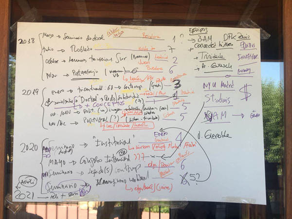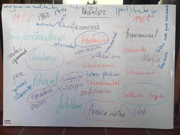 En el proyecto MoDe(s) 1 pusimos especial énfasis en el desarrollo de una nueva cartografía del período donde destacábamos el papel desempeñado por las redes transnacionales de colaboración artístico-política, más allá del sistema de bloques, con especial atención al eje transatlántico. Este movimiento de descentramiento nos permitía cuestionar las construcciones historiográficas canónicas de la modernidad artística/modernismo y avanzar hacia una idea compleja de modernidades que interactúan en un territorio proto-globalizado. A lo largo este taller preparatorio, comprobamos cómo esta dimensión cartográfica del proyecto se asienta y se hace más compleja con la incorporación del glosario. En las sesiones de trabajo elaboramos un mapa de las palabras claves de nuestras investigaciones, así como de los conceptos que queremos tratar en profundidad, buscando las coincidencias y relaciones (ver foto). Como era previsible, el mapa pronto se convirtió en una maraña de flechas tan complicada de interpretar como el período que estudiamos.
